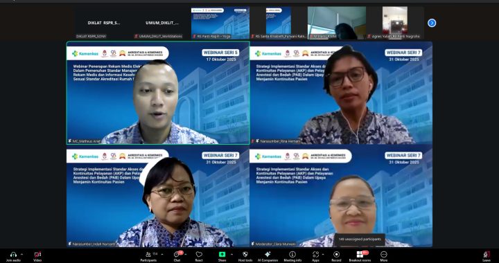 Pelayanan kesehatan yang berkualitas sangat bergantung pada sinergi tim pelayanan dalam memberikan asuhan kepada pasien. Menyadari pentingnya hal tersebut, sebuah webinar bertajuk “Pentingnya Kolaborasi Tim Pelayanan dalam Pemenuhan Standar Pengkajian Pasien (PP) dan Pelayanan dan Asuhan Pasien (PAP)” diselenggarakan secara daring pada Jumat, 14 November 2025, melalui platform Zoom Meeting. Kegiatan ini diikuti oleh 170 tenaga kesehatan dari berbagai fasilitas pelayanan kesehatan di Indonesia.